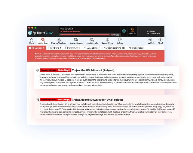 SpyHunter는 탐지된 개체를 범주로 그룹화하여 맬웨어, PUP(잠재적으로 원치 않는 프로그램), 개인 정보 위험 및 기타 보안 위협을 사전에 제거하는 데 도움을 줍니다. SpyHunter는 또한 시스템을 해커와 악의적인 행위자에게 노출시킬 수 있는 설치된 소프트웨어의 보고된 취약점을 식별합니다.