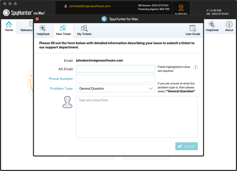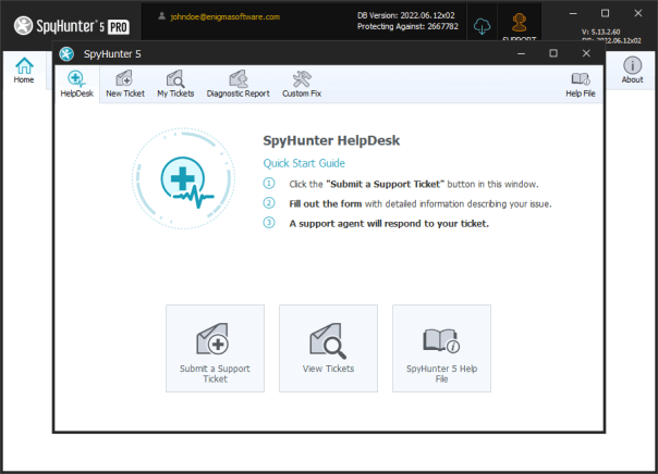 완전한 맬웨어 제거 및 고객 만족을 보장하기 위해 SpyHunter는 통합 개인화 된 일대일 기술 지원 서비스인 SpyHunter HelpDesk와 함께 제공됩니다. 가입자는 발생하는 모든 문제를 보고하고 진단 보고서를 생성 및 전송하며 SpyHunter에서 직접 특수 맞춤형 수정 사항을 받을 수 있습니다.