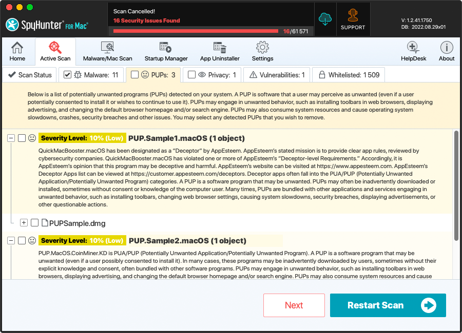 SpyHunter는 잠재적으로 원치 않는 프로그램("PUP")을 감지하고 제거할 수 있습니다. PUP는 광고 소프트웨어, 원치 않는 소프트웨어, 그레이웨어 및 기타 성가신 것과 같이 사용자가 원치 않는 것으로 인식할 수 있는 프로그램입니다.