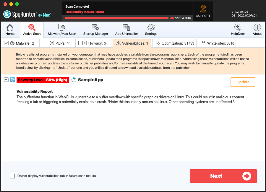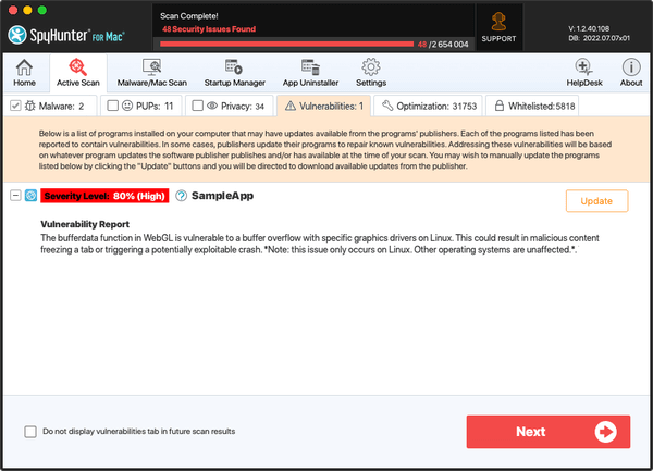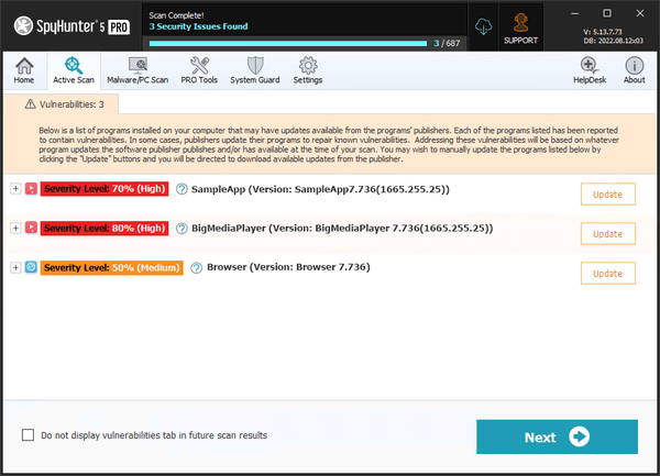 취약점 탐지SpyHunter의 취약성 검사는 보고된 취약성을 포함할 수 있는 시스템의 합법적인 프로그램을 식별하는 데 도움이 됩니다. 사용자는 이 정보를 사용하여 취약점을 복구하거나 업데이트하여 보안을 강화할 수 있습니다. |