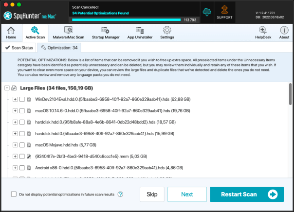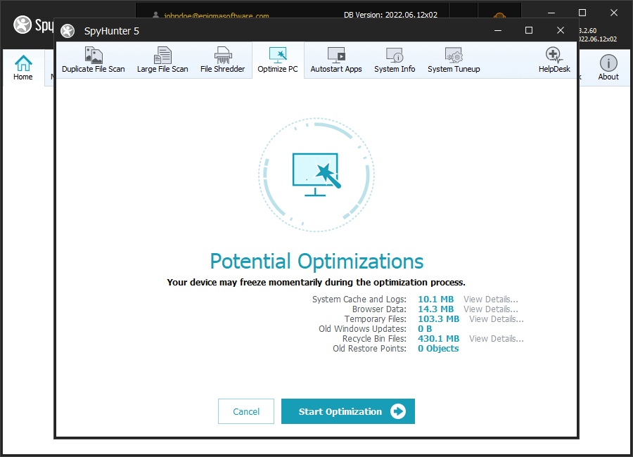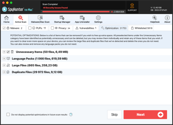 최적화 스캔 및 기능SpyHunter 5는 잠재적으로 유효하지 않거나 불필요한 레지스트리 개체를 감지하고 해결하는 것을 포함하여 시스템 최적화 목록을 제공합니다. 불필요한 레지스트리 및 시스템 데이터를 선택적으로 삭제하여 추가 디스크 공간을 확보하고 개인 정보 보호를 강화하며 개인 데이터를 보호할 수 있습니다. |