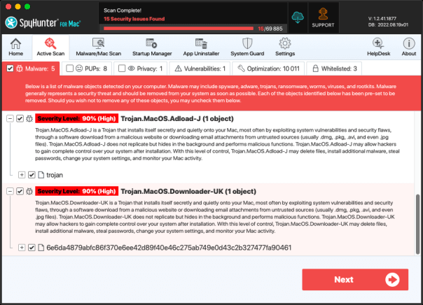 맬웨어 및 PUP 탐지 및 제거SpyHunter의 사용하기 쉬운 자동 제거 엔진은 초보자 및 전문가 사용자에게 맬웨어, 트로이 목마, 랜섬웨어, 웜, 바이러스, 스파이웨어, 루트킷, 키로거, 브라우저 하이재커, 애드웨어 및 기타 위협을 효과적으로 제거할 수 있는 기능을 제공합니다. SpyHunter는 또한 잠재적으로 원치 않는 프로그램(PUP)을 감지합니다. |