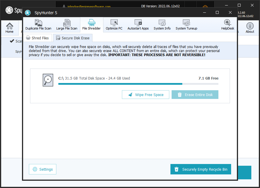 보안 디스크 지우기SpyHunter Pro를 사용하면 몇 번의 클릭으로 전체 디스크를 안전하게 지울 수 있습니다. 이 기능은 불필요한 드라이브를 판매하거나 양도하려는 경우 개인 정보를 보호하는 데 도움이 될 수 있습니다. |