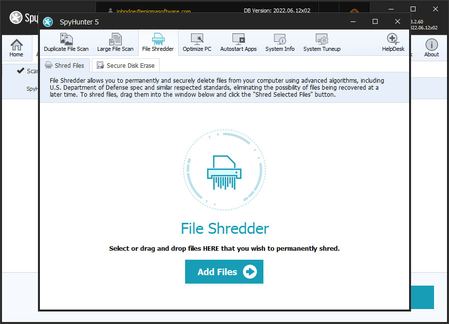 SpyHunter의 파일 분쇄기는 더 이상 원하지 않는 데이터를 안전하고 영구적으로 지우는 쉬운 방법을 제공하도록 설계되었습니다. 일반적인 방법을 사용하여 Windows 파일을 삭제하면 데이터가 컴퓨터에 남아 있으며 특수 소프트웨어로 복구할 수 있습니다. SpyHunter의 파일 분쇄기는 민감한 정보를 복구할 수 없도록 완전히 삭제하도록 설계되었습니다. SpyHunter를 사용하면 DoD, NIST 및 NSA 표준을 포함한 다양한 삭제 알고리즘 중에서 선택할 수 있습니다. 또한 File Shredder를 사용하여 Windows 휴지통에 있는 모든 파일을 안전하게 지워 복구를 완전히 방지할 수 있습니다.